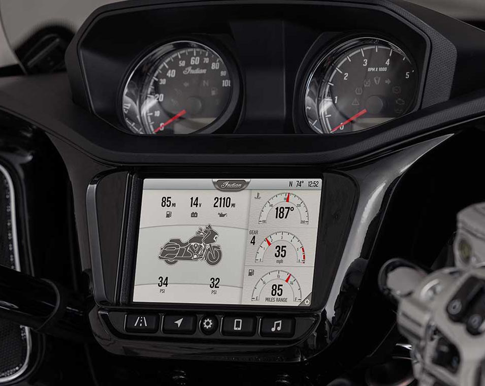 | Standard utstyr | 7-tommers berøringsskjerm drevet av RIDE COMMAND: 7-tommers berøringsskjerm med sanntidsklokke; omgivende lufttemperatur; lydinformasjon display; kart/navigasjon; Bluetooth-status for telefon og headset; kjøretøystatus (dekktrykk, spenning, motortimer, oljeskift); kjøretøyinfo (hastighet, rekkeviddemåler, RPM, giranvisning); gjeldende kjøredata (avstand, bevegelsestid, stopptid, høyde, høydeendring); tripptellere; valg av kjøremodus; skjermens lysstyrke; utlesing av feilkode for kjøretøy; Apple CarPlay-integrasjon. |