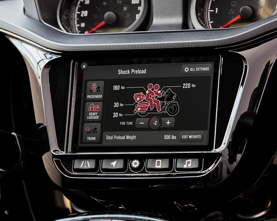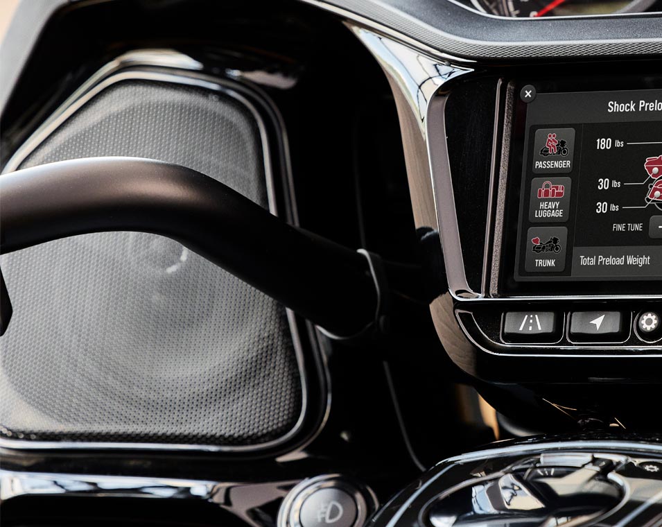 | Standard utstyr | Smart Lean-teknologi; Elektronisk justerbar forspenning av bakdemper; oppvarmet sal; Integrerte kjørelys i knekåper; Lagringsplass i knekåper; 7 i berøringsskjerm drevet av Ride Command med Apple CarPlay-integrasjon; Valgbare kjøremoduser; Deaktivering av bakre sylinder; Cruise Control; Overvåking av dekktrykk; Harde sidevesker og toppboks med fjernstyring; 136+ liters lagringsplass; Highway bars; Justerbare fotbrett for passasjer; Brembo bremser; ABS; Nøkkelfri tenning; Chassismontert kåpe; Elektronisk justerbar vindskjerm; Justerbare kåpeluftstrømningsventiler; Oppvarmede håndtak; 200 watt lydsystem med AM/FM, Bluetooth, USB, smarttelefonkompatibel inngang; 12V ladeport |