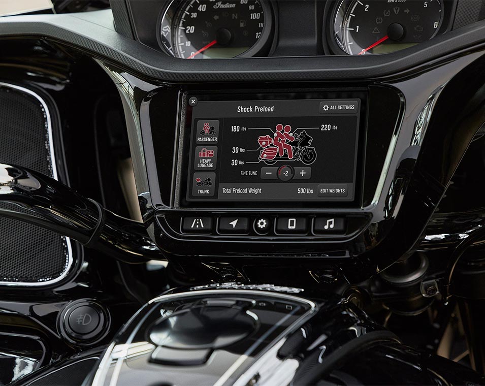 | Standard utstyr | Smart Lean-teknologi; Elektronisk justerbar forspenning av bakdemper; oppvarmet sal; Integrerte kjørelys i knekåper; Lagringsplass i knekåper; 7 i berøringsskjerm drevet av Ride Command med Apple CarPlay-integrasjon; Valgbare kjøremoduser; Deaktivering av bakre sylinder; Cruise Control; Overvåking av dekktrykk; Harde sidevesker og toppboks med fjernstyring; 136+ liters lagringsplass; Highway bars; Justerbare fotbrett for passasjer; Brembo bremser; ABS; Nøkkelfri tenning; Chassismontert kåpe; Elektronisk justerbar vindskjerm; Justerbare kåpeluftstrømningsventiler; Oppvarmede håndtak; 200 watt lydsystem med AM/FM, Bluetooth, USB, smarttelefonkompatibel inngang; 12V ladeport |