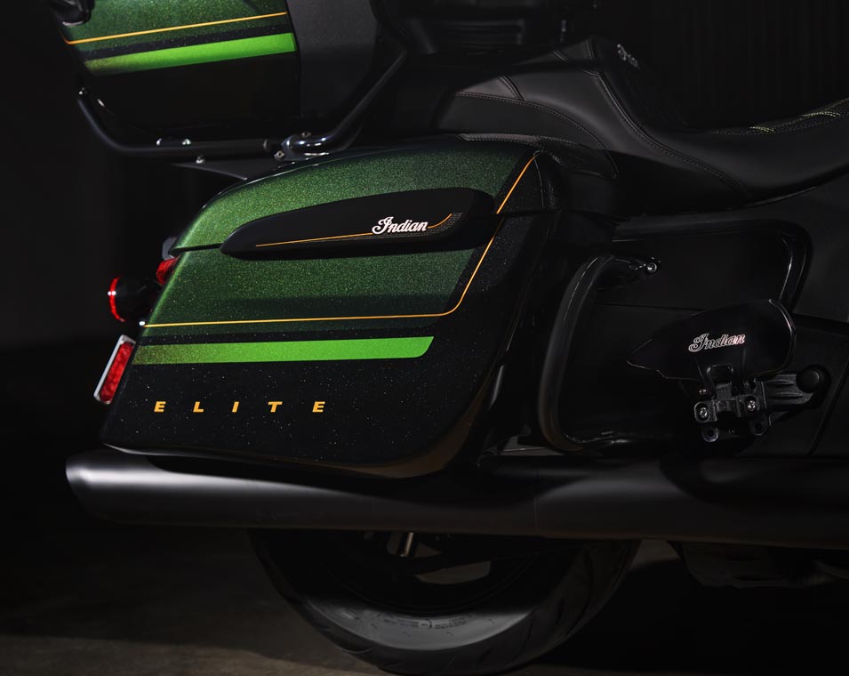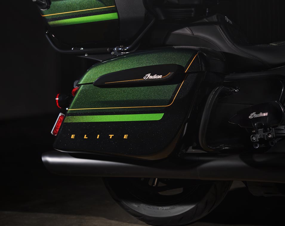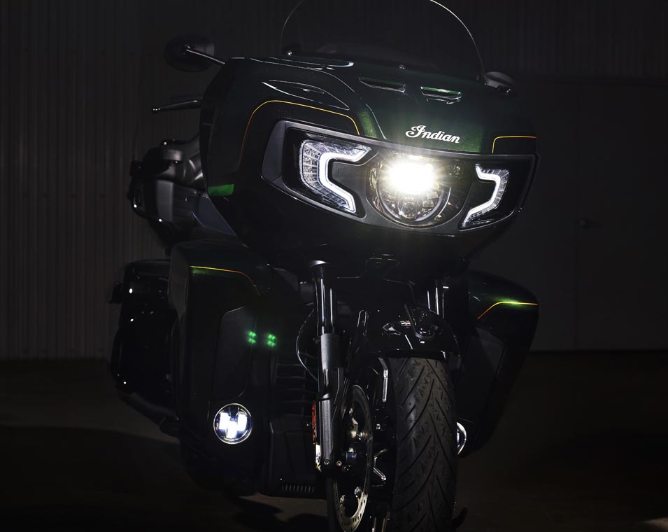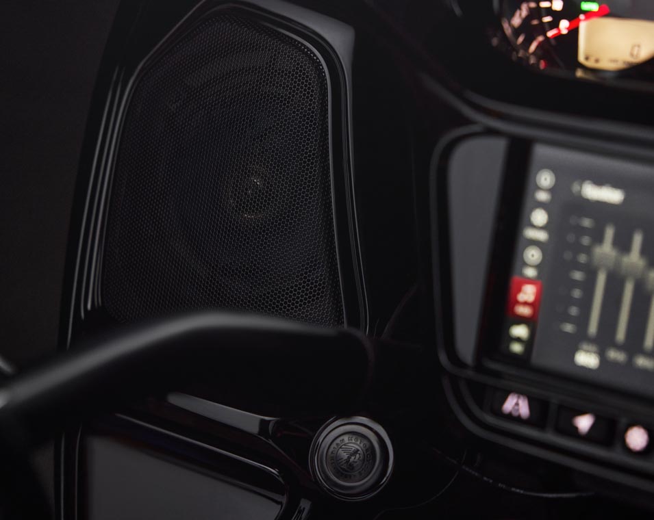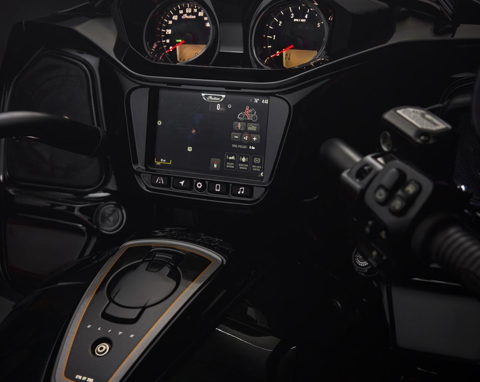 | Standard utstyr | Harde sidevesker med fjernstyrt låsemekanisme, elektronisk justerbar vindskjerm, 140+ liter lagringsplass, nøkkelfri tenning, justerbare ventiler i knekåper, USB-lader, dekktrykkovervåkingssystem (TPMS), fotbrett med Indianerhode-logo for fører og passasjer, sal med varme, brytere med baklys, varme i håndtak og armstøtte for passasjer. |